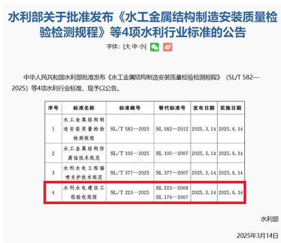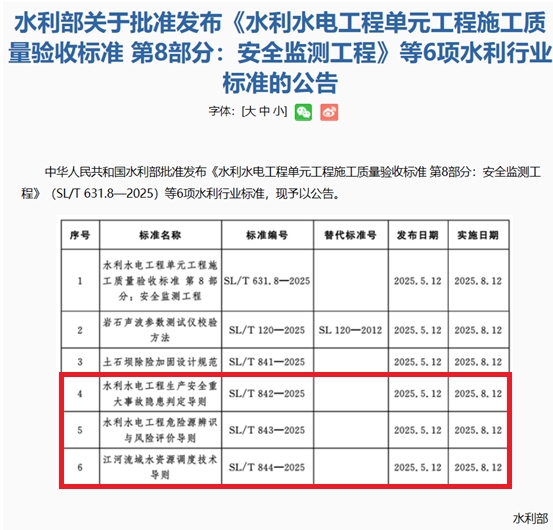 近期,水利部發(fā)布2025年第9號、第11號公告,由公司主編的《水利水電建設(shè)工程驗收規(guī)程》(SL/T 223—2025)、《水利水電工程危險源辨識與風險評價導(dǎo)則》(SL/T 843—2025)和參編的《水利水電工程生產(chǎn)安全重大事故隱患判定導(dǎo)則》(SL/T 842—2025)、《江河流域水資源調(diào)度技術(shù)導(dǎo)則》(SL/T 844—2025)等4項水利行業(yè)標準獲批準發(fā)布,將分別于2025年6月14日和8月12日起實施。
