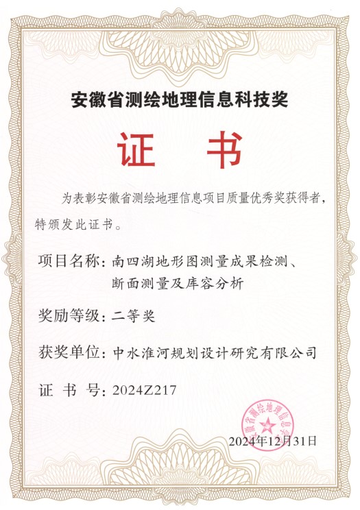 近期,安徽省測繪地理信息學(xué)會(huì)發(fā)布《2024年度安徽省測繪地理信息科技獎(jiǎng)勵(lì)評(píng)審結(jié)果公告》,公司申報(bào)的《南四湖地形圖測量成果檢測、斷面測量及庫容分析項(xiàng)目》榮獲項(xiàng)目質(zhì)量優(yōu)秀獎(jiǎng)二等獎(jiǎng)。