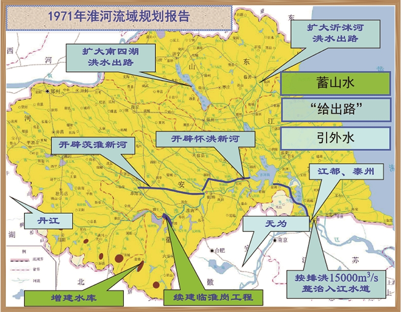 1971年2月,治淮規劃小組向國務院上報了《關于貫徹執行毛主席“一定要把淮河修好”指示的情況報告》及其附件《治淮戰略性骨干工程說明》、《關于治淮工程若干問題的討論情況》。本輪規劃提出“ 蓄山水 、給出路 、引外水 ”的治理思路 。按規劃完成鲇魚山水庫及其灌區工程,開挖了茨淮新河,懷洪新河因國家財政困難而中途停建。茨淮新河和懷洪新河為本次規劃提出的擴大淮河中游洪水出路的戰略性大型骨干工程,是一條與干流平行的大型人工河道,基本橫貫淮河中游,在我國七大江河中是獨有的。